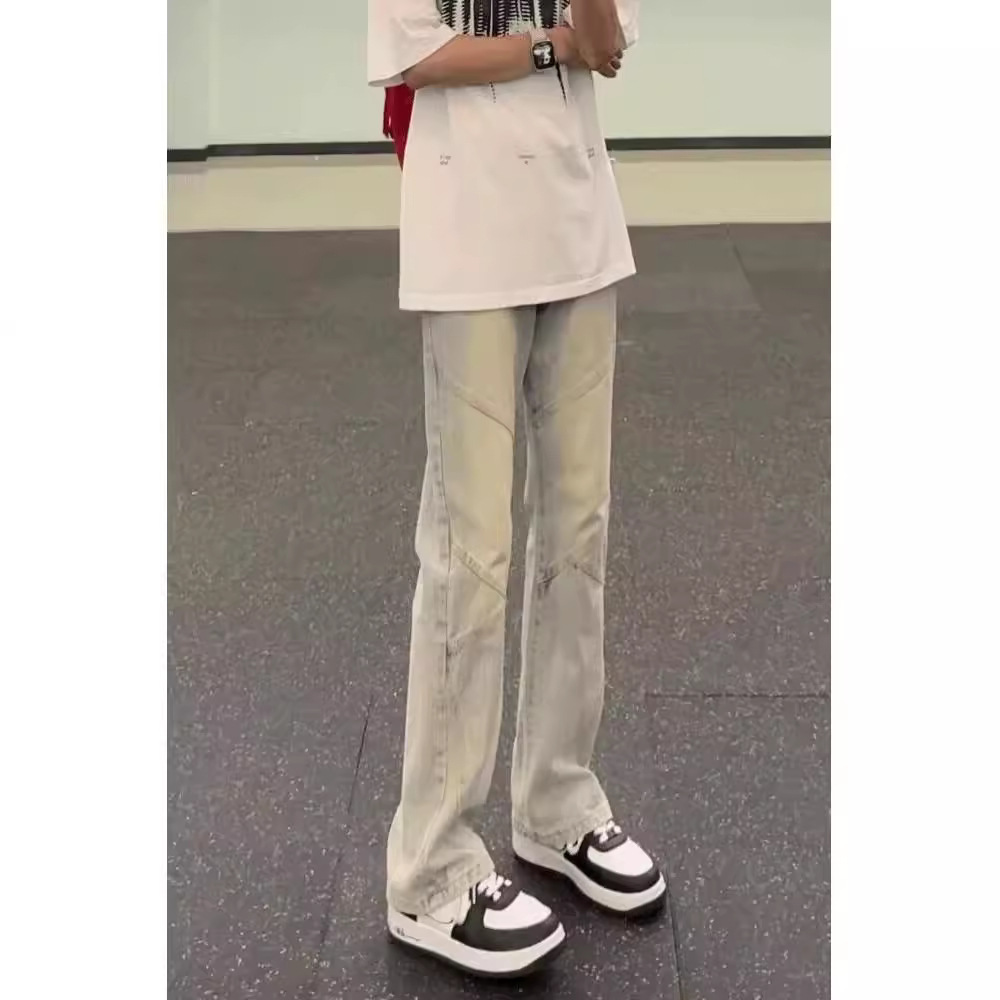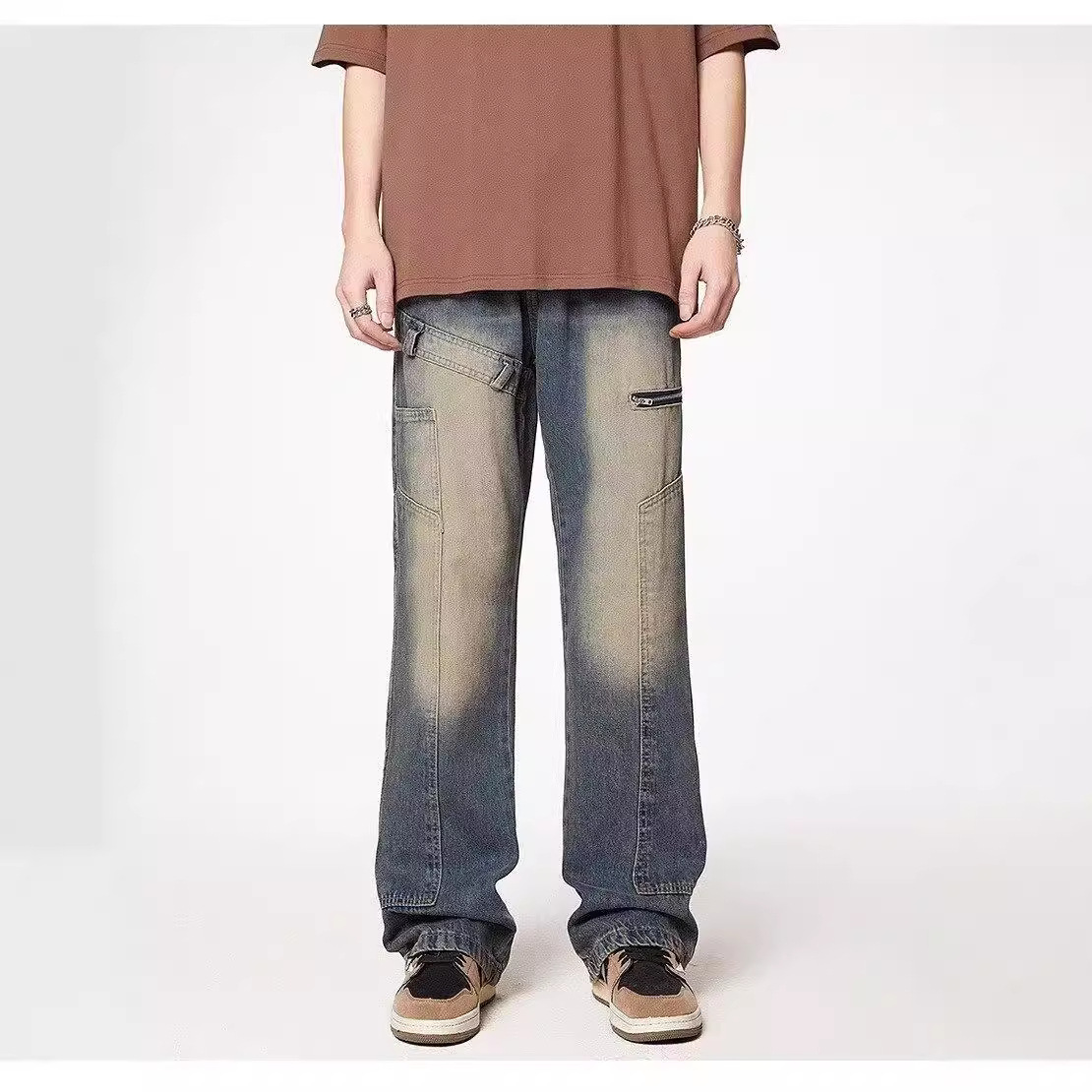 ジーパンの男性のファッションブランドの夏のアメリカの高い街の復古の小さいラッパのズボンの工装のゆったりしているまっすぐな筒の百合は古いズボンの男をします。