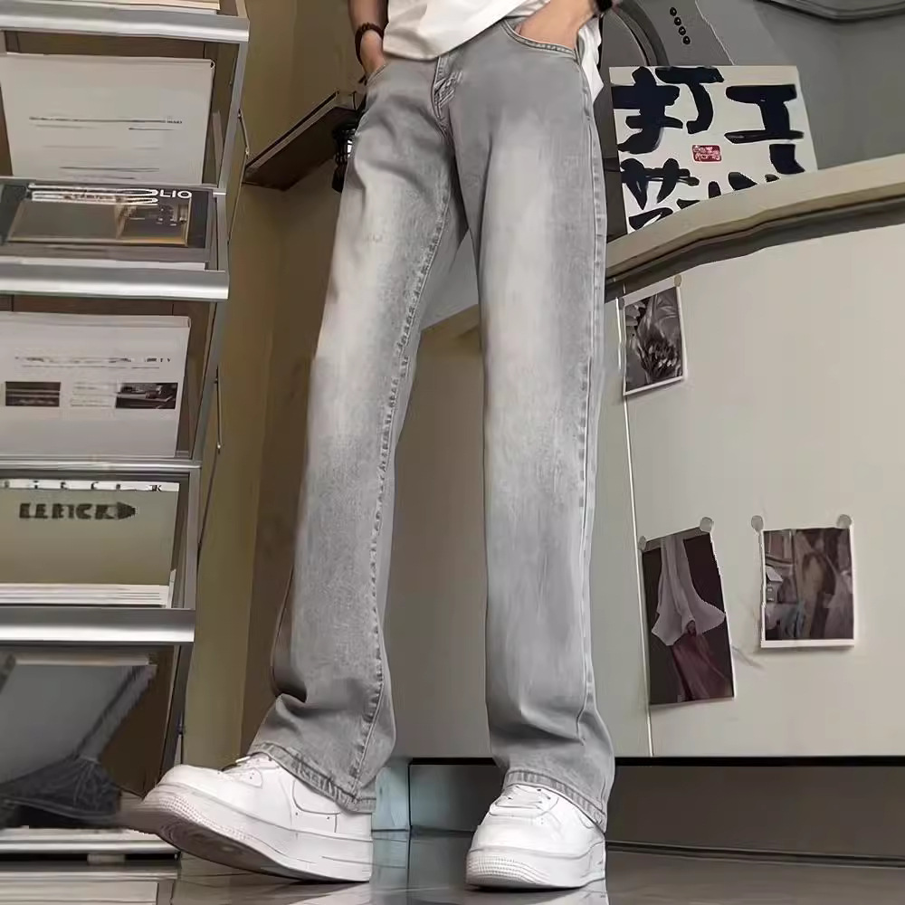 夏の薄い灰皿のセメントの色の微ラッパのジーパンの男性の潮の高級感のズボンのアメリカの復古の狭い版のストレートなズボン