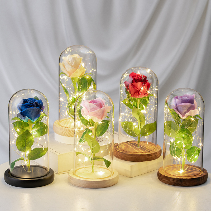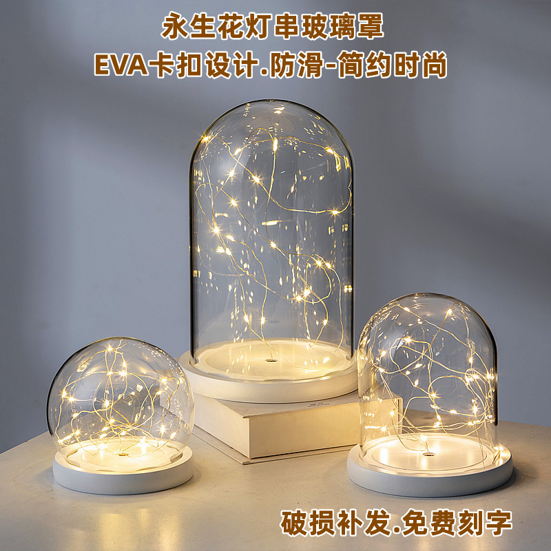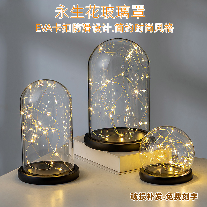 クリエイティブDIYプリザーブドフラワー滑り止めガラスカバー飾り物、家庭装飾、手作り透明防塵デスクトップ、ライト付き、ストレス軽減