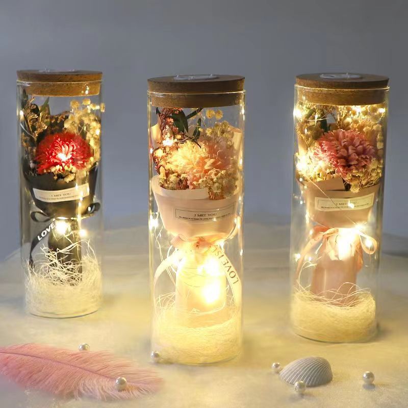 メーカー直販永生花ガラスカバー展示ケース直筒円柱コルク栓発光ストリングライトドライ花テーブル置物