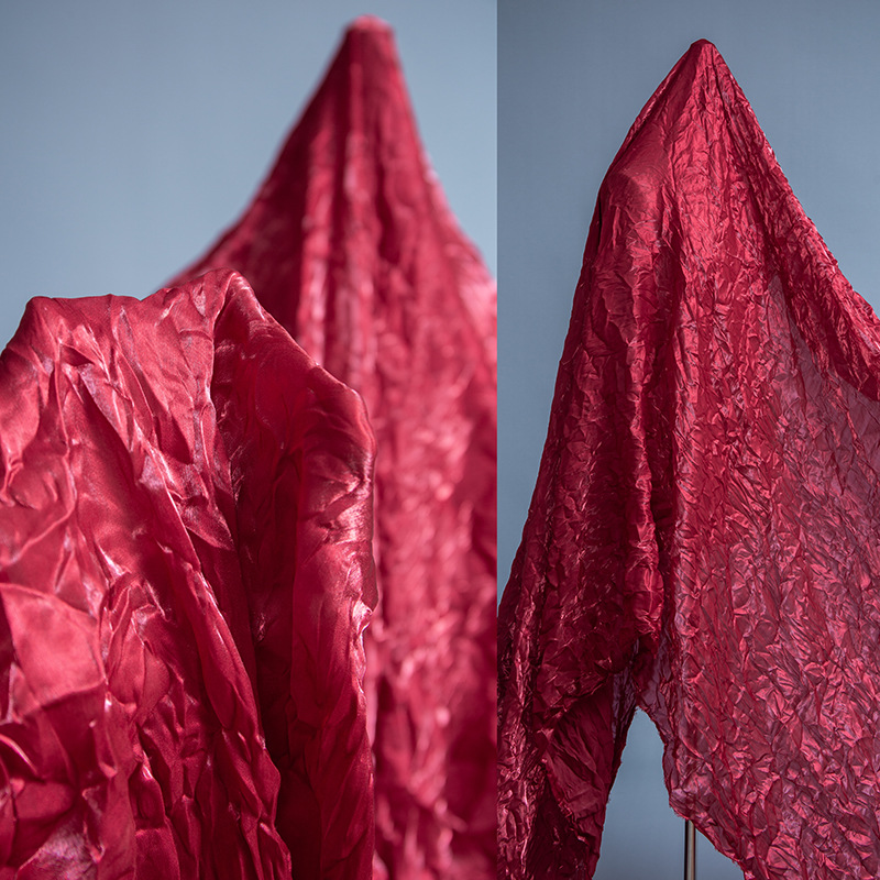 赤いしわの布地はシワの筋の理屈の手作りのdiyの結婚式の背景の装飾画のワンピースの服装の布地を押します。