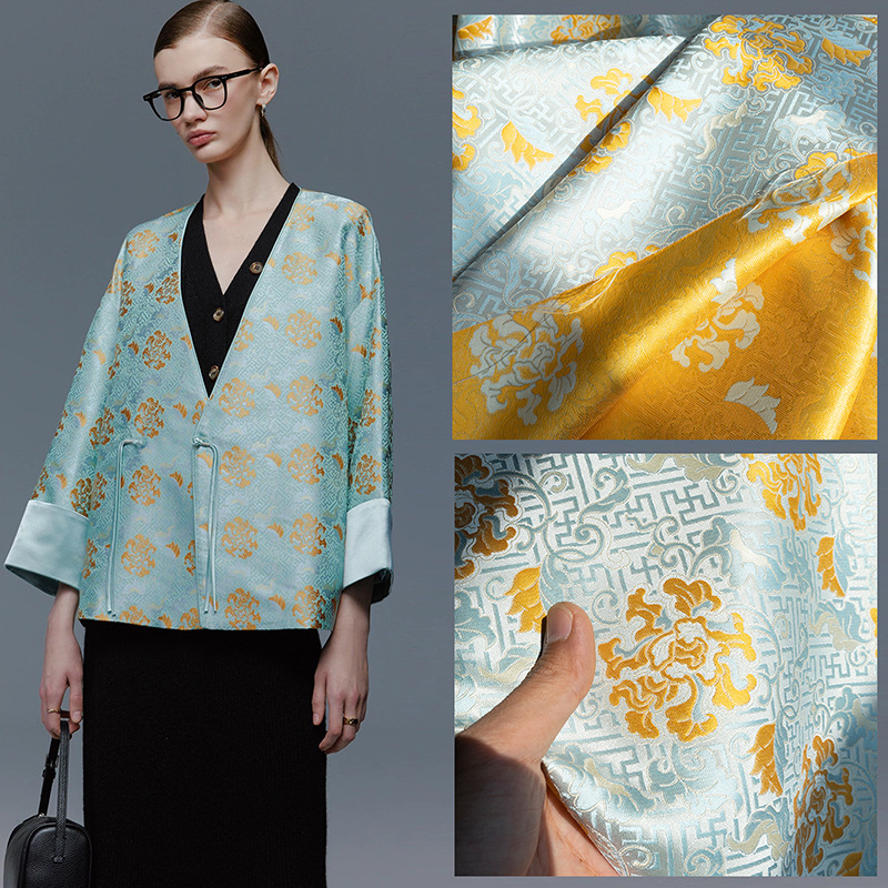 空の青い色は宋ジャカードの織物の牡丹の花の回紋の錦織の布地のチャイナドレスのコートの唐装のデザイナーの生地をまねます。