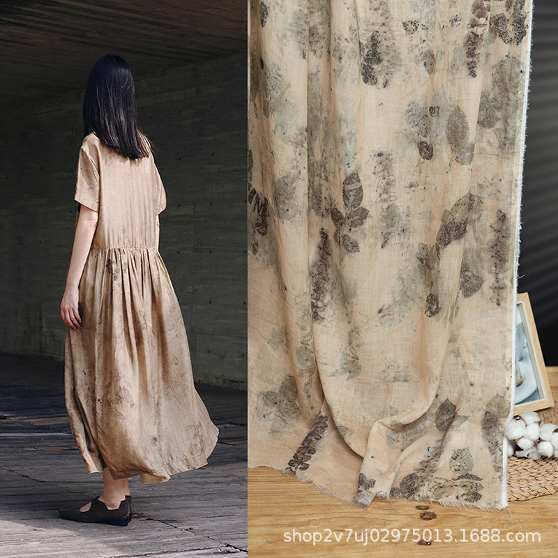 純ラミー麻植物捺染生地水墨点染高級ワンピースストラップスカート服装デザイナー生地が薄い