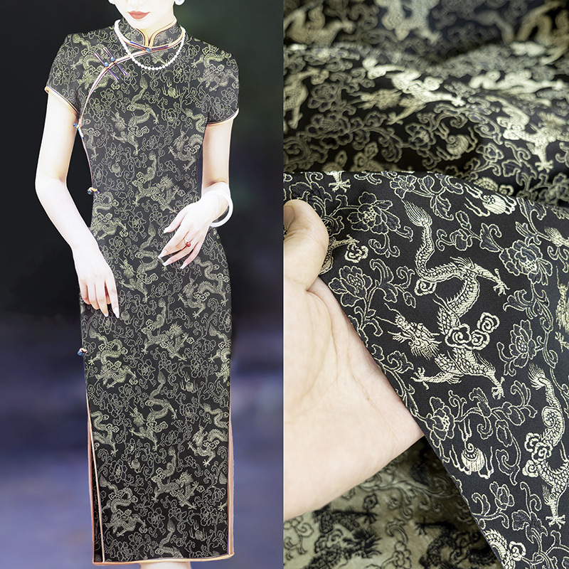 黒金色龍形高密ジャカード生地中国風錦織は広々とした龍紋コートで服装デザイン生地を演出している