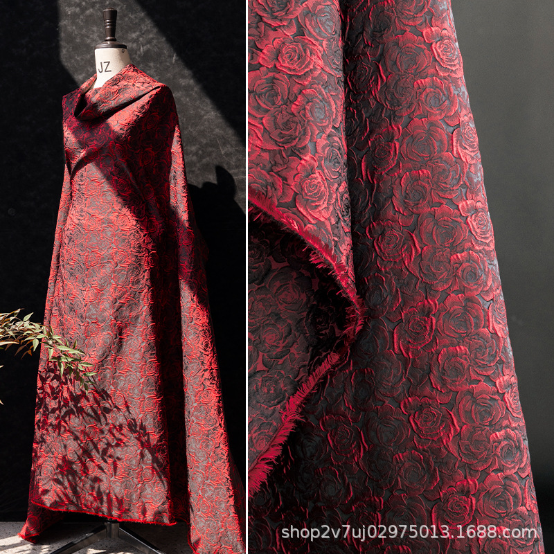 ワインレッドのジャカード生地のバラの花はとても広い国風のワンピースのチャイナドレスのコートの創意的な服装のデザイナーの生地です。