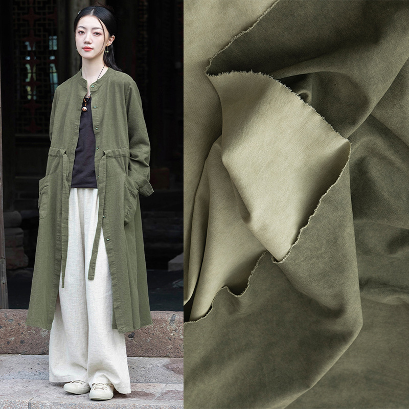 軍の緑の復古綿麻の布地は色を炒めて古い綿のコートの風衣のスカートのズボンの服装のデザイナーの布地をします。
