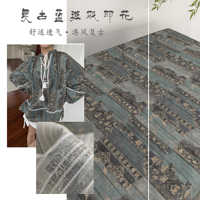 レトロな香港スタイルの青い斑点のあるコントラストプリント生地ダークパターンシャツスカートパンツ衣類デザイナー生地