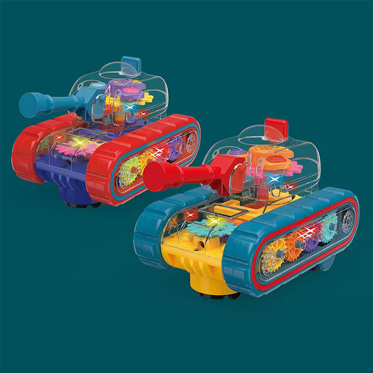 ギアのおもちゃの戦車の万能走行の砲塔は自動的に回転して音の光の透明な子供のおもちゃの車の露店の卸売りを持ちます。