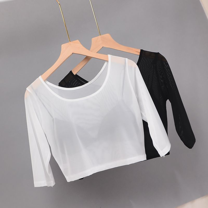 ネットの紗は底を打って春の夏服の新型の女性のレースの短いタイプの底のシャツの上着の中で袖の半分の半身の内はシャツのtシャツを掛けます