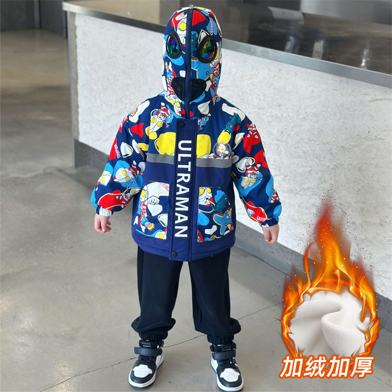 男の子用ウルトラマン反射ベルベット厚手暖かい新しいフード付きメガネジャケット、秋冬用、防風性、通気性、耐摩耗性