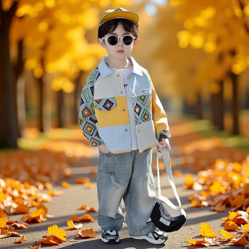 男の子用コットンデニムジャケット、春と秋の新しいスタイル、ハンサムなスタイル、子供用の柔らかく通気性があり、耐摩耗性があり、ファッショナブルでトレンディなジャケット