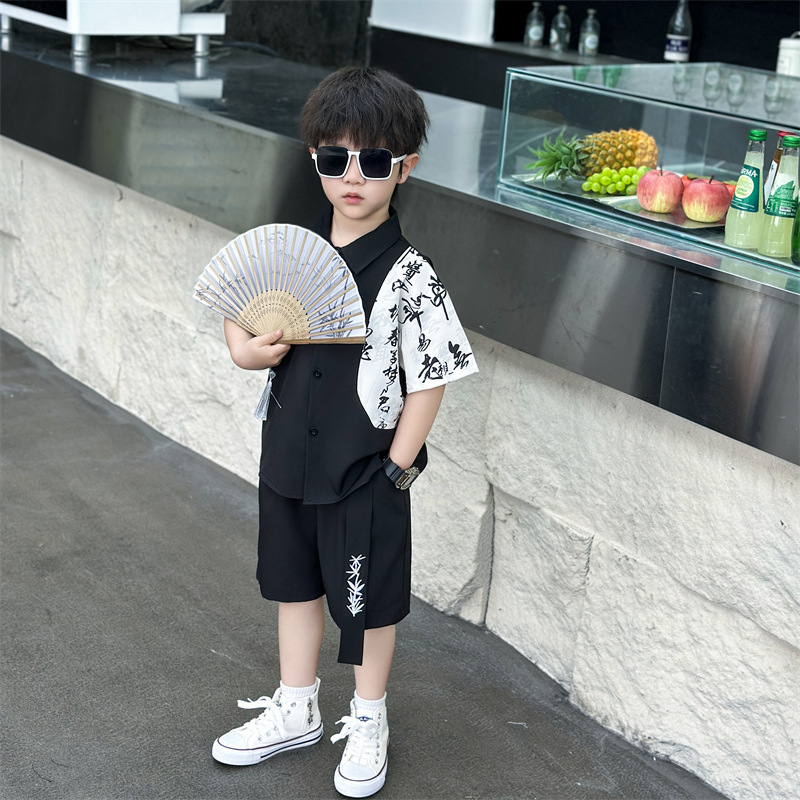男の子用漢服唐装夏用半袖セット 子供用新中式民族風男児一歳服 涼しくて通気性があり柔らかい