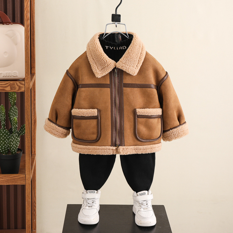 男の子用ファー一体型コート、秋冬用暖かくてスタイリッシュな子供用スエード服、ベルベット加工、卸売革製コート