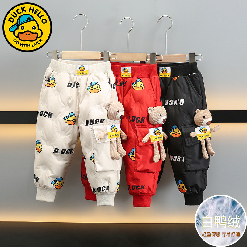 男の子と女の子用の小さな黄色いアヒル柄の白いダウンパンツ、冬の新作、保温性、防寒性、厚手、漫画風、柔らかく、軽量、恒温性