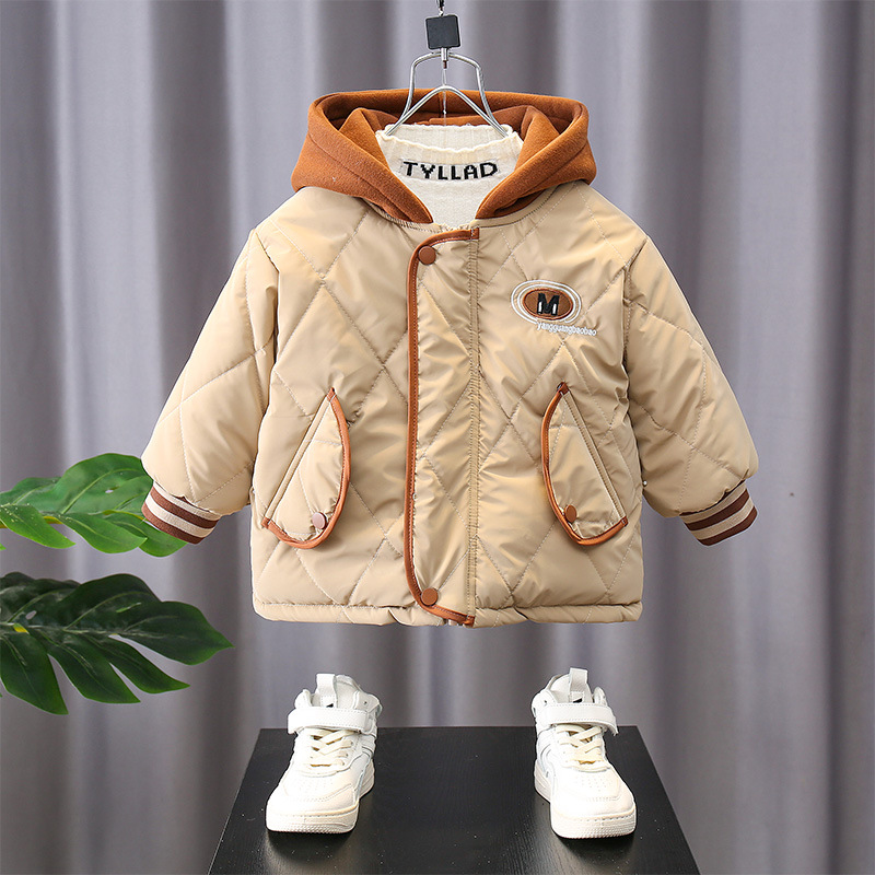 男の子用裏起毛綿服2025年新作冬服男の子用厚手保温ジャケットハンサムなベビーフード付きダウン綿服