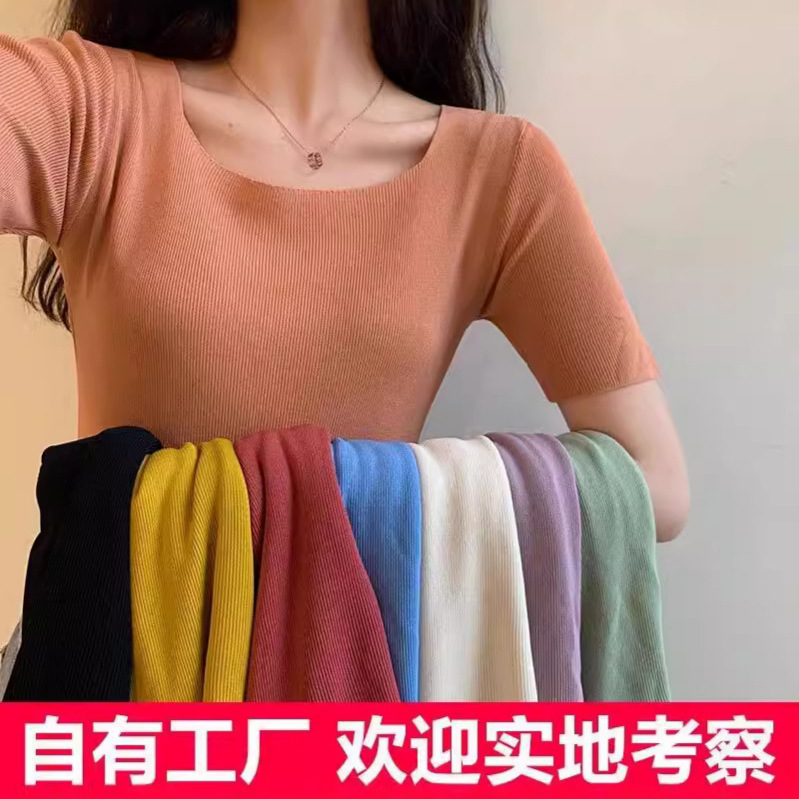 シンプルな方襟半袖春夏の氷爽糸女装上着修身tシャツ女性ニットシャツ純色薄いタイプ