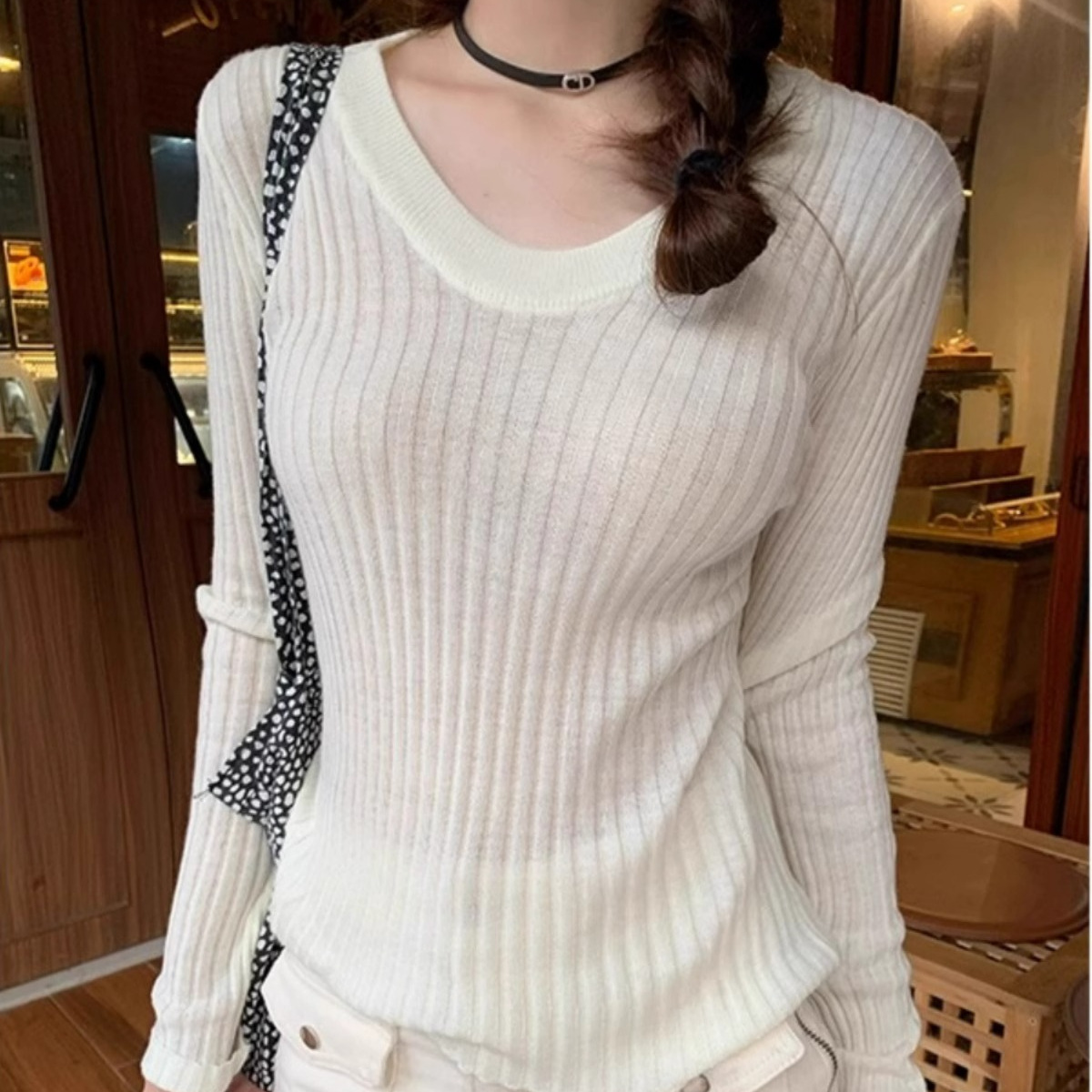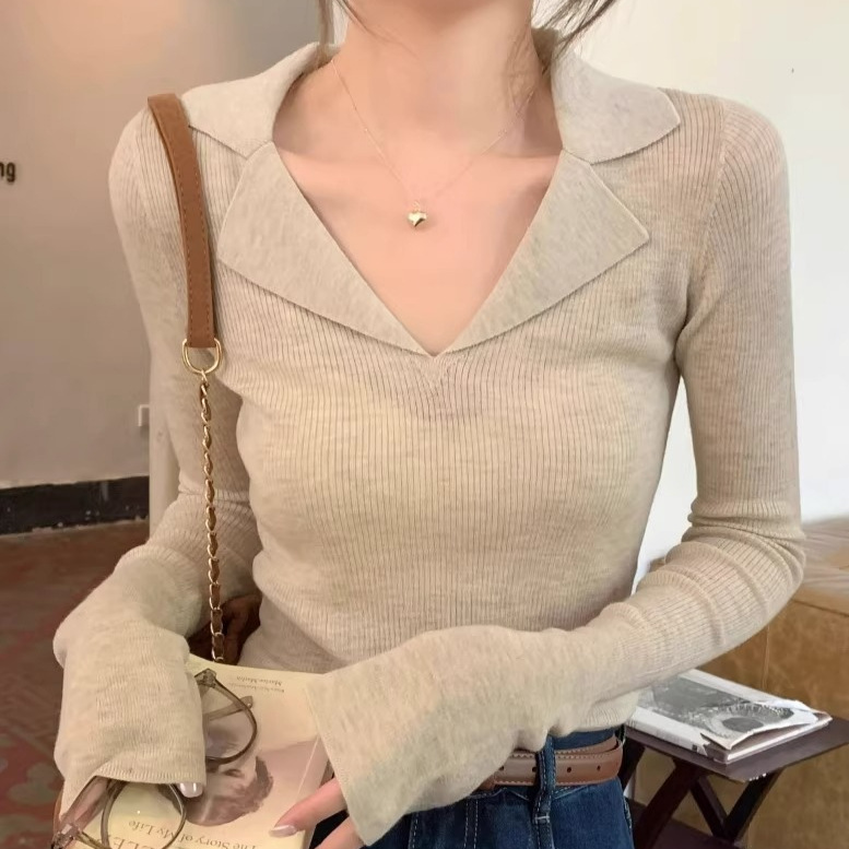 純色vネック修身tシャツ上着女性2024春秋新ソフトモチモチ減齢紙片人が肌を編んでシャツを編む
