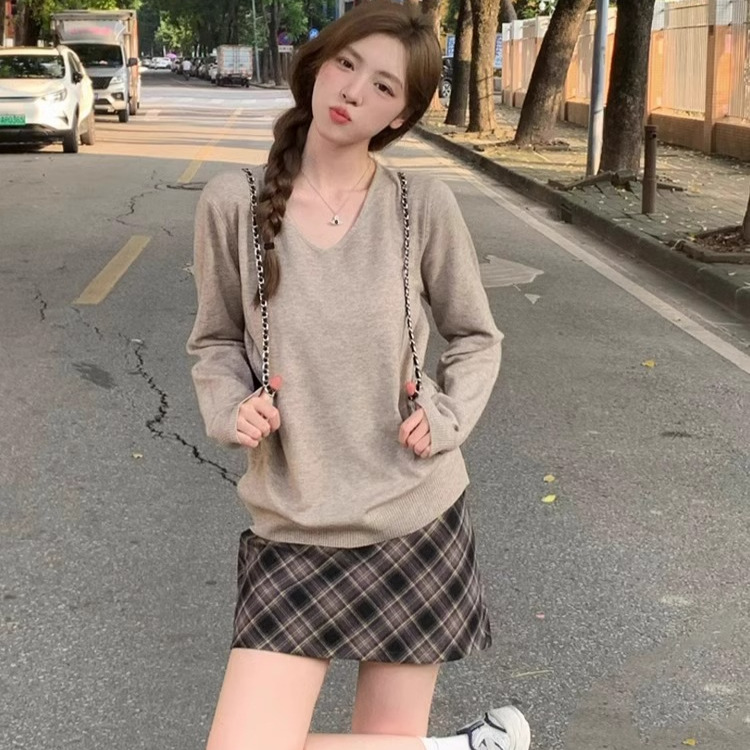 Vネック長袖tシャツニットの底のシャツの女性の中にデザイン感があります。
