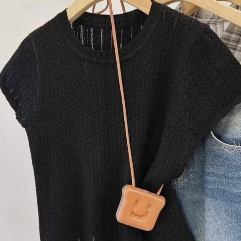 ニットの女性の半袖2024春の夏の新しい丸首の透かし彫りの薄いショートタイプの底のデザイン感の純色の上着