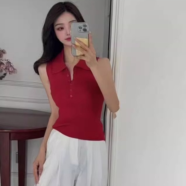 気質復古袖なしPOLO襟ベスト女性ワインレッド小衆高級感修身外着ニット上着夏