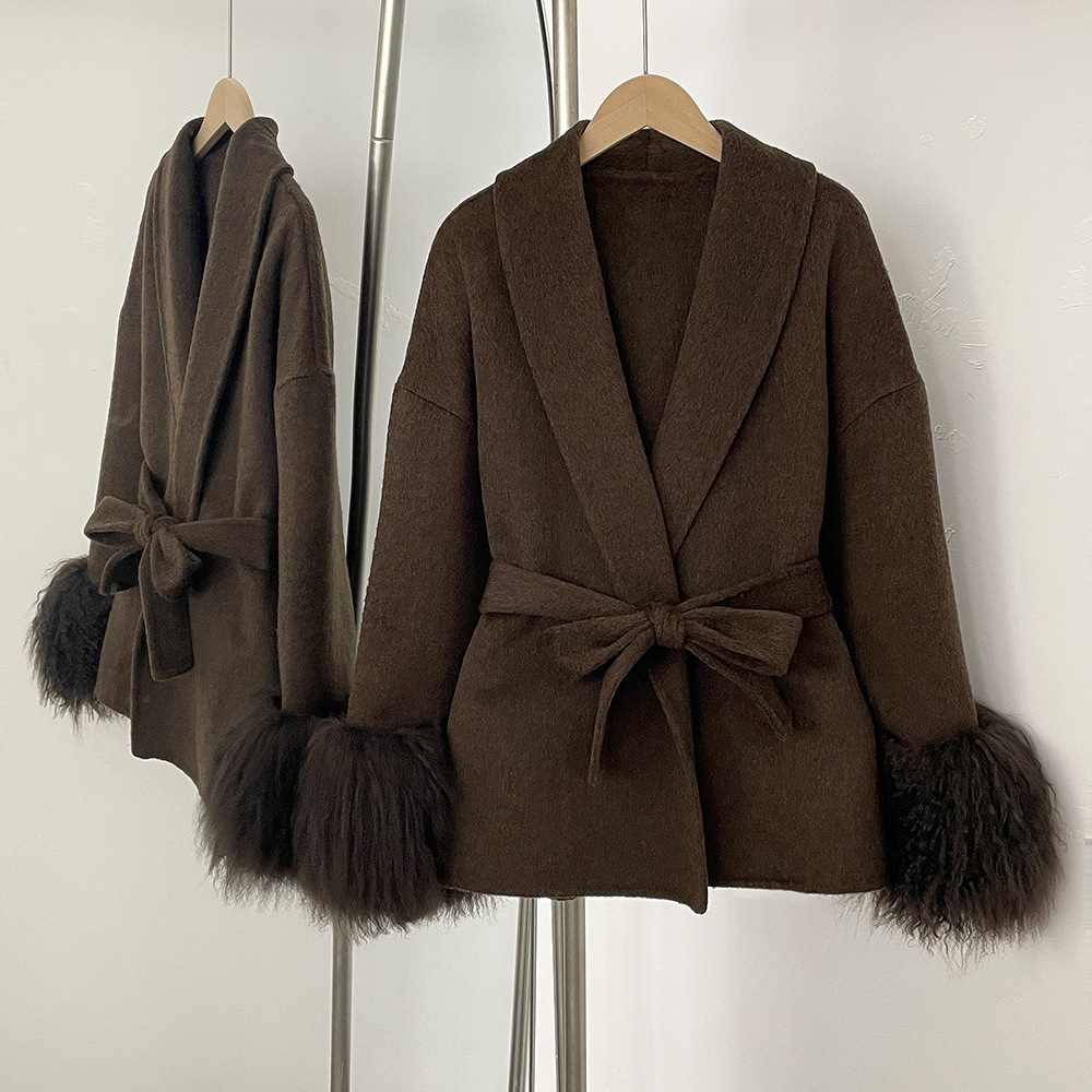 新しいビーチウール両面ウールコートレディースショート万能コート気質バスローブスタイル両面ウールコート
