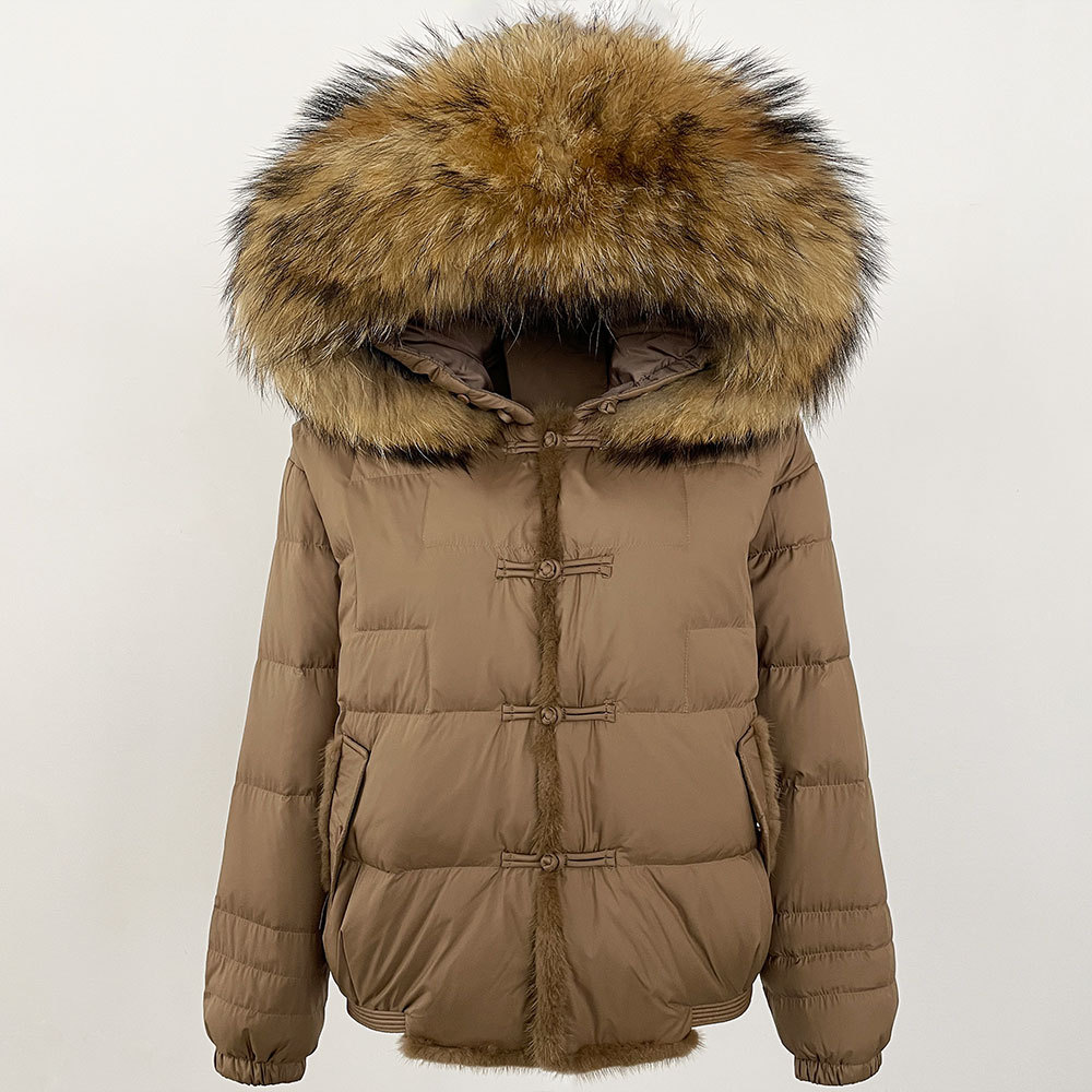 2024クロスボーダー秋冬新作キツネ毛大毛襟フード付きダウンジャケット女性ショートウール中国風バックルコート