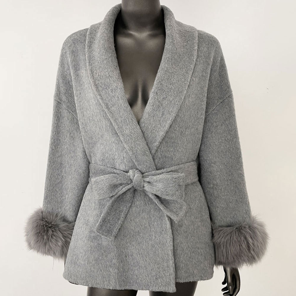 短い気質のコート、バスローブ、人気の本物のキツネの袖口、ウールの両面ウールコート、女性用両面ウールコート