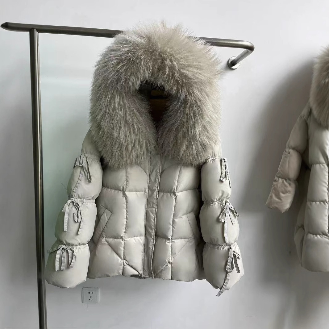 2025年冬新作高級ファー大判フォックスファー襟付きフードダウンジャケットレディース蝶結び厚手保温コート