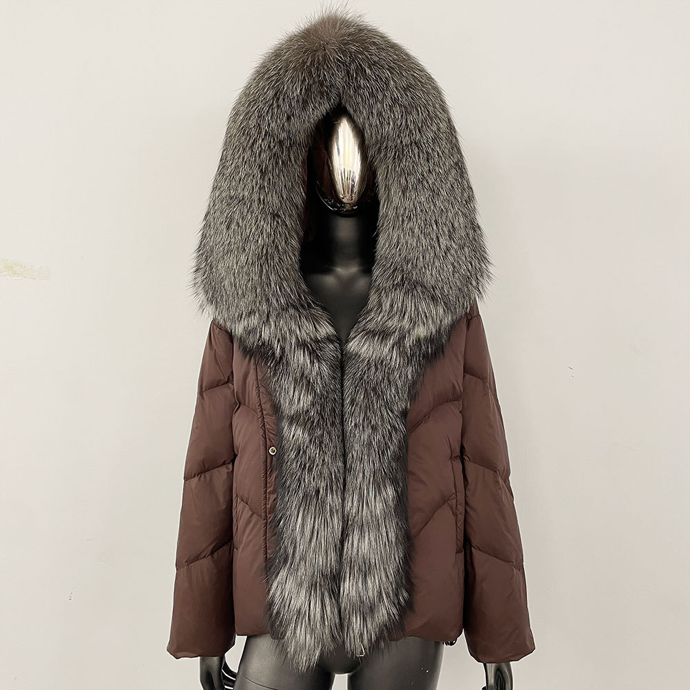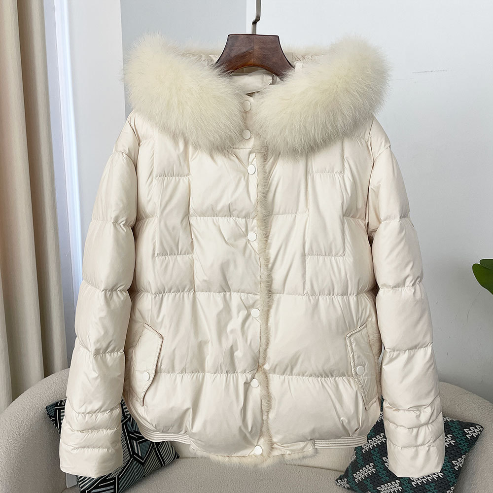 2025年冬新作ダウンジャケット、フォックスファー襟付きフード、高級婦人秋冬コート、ファー、ホワイトダックダウン