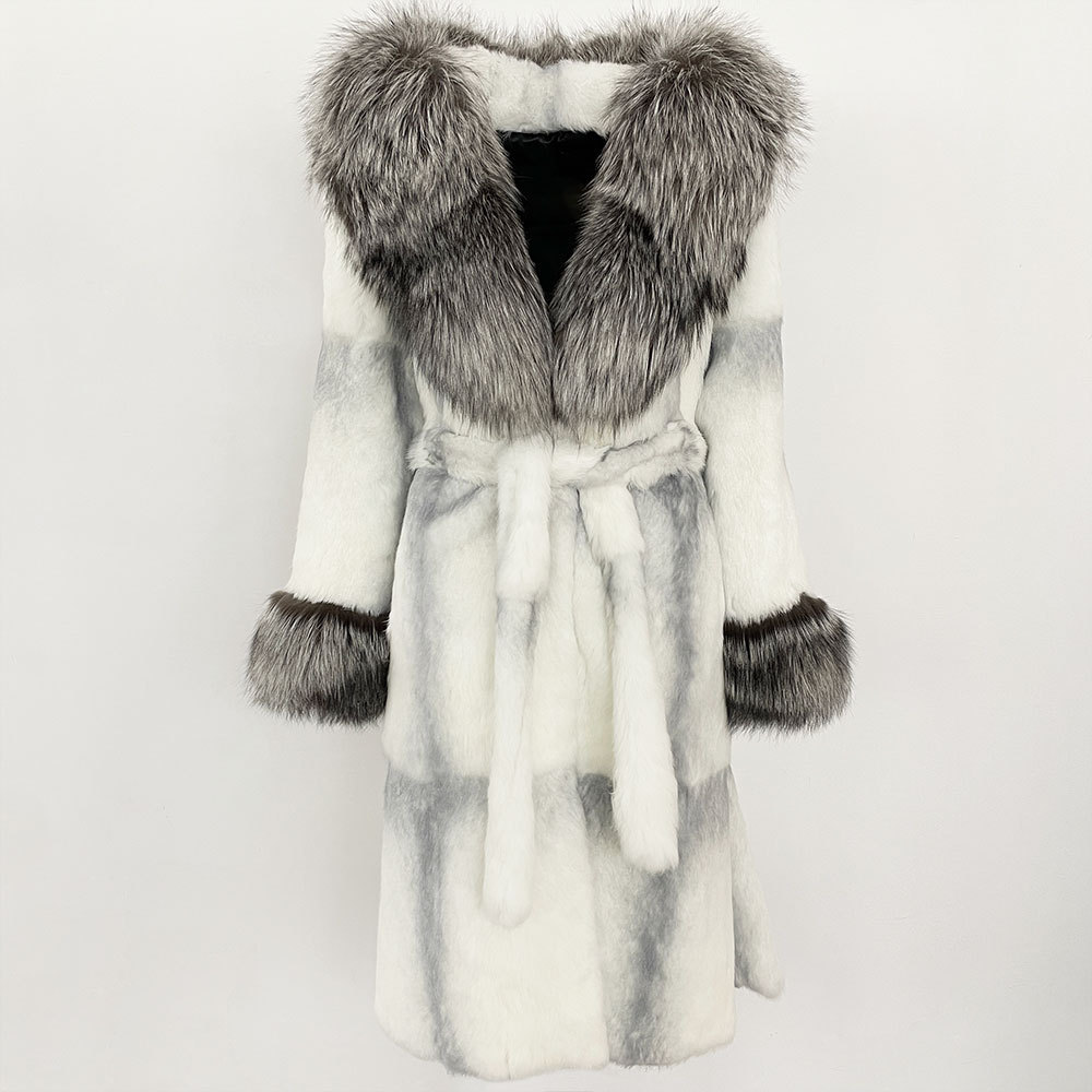 2025 ホワイトクロスフード付きフォックスビッグファー襟ロングスイング膝上ロングファーワンピースファージャケット女性のための