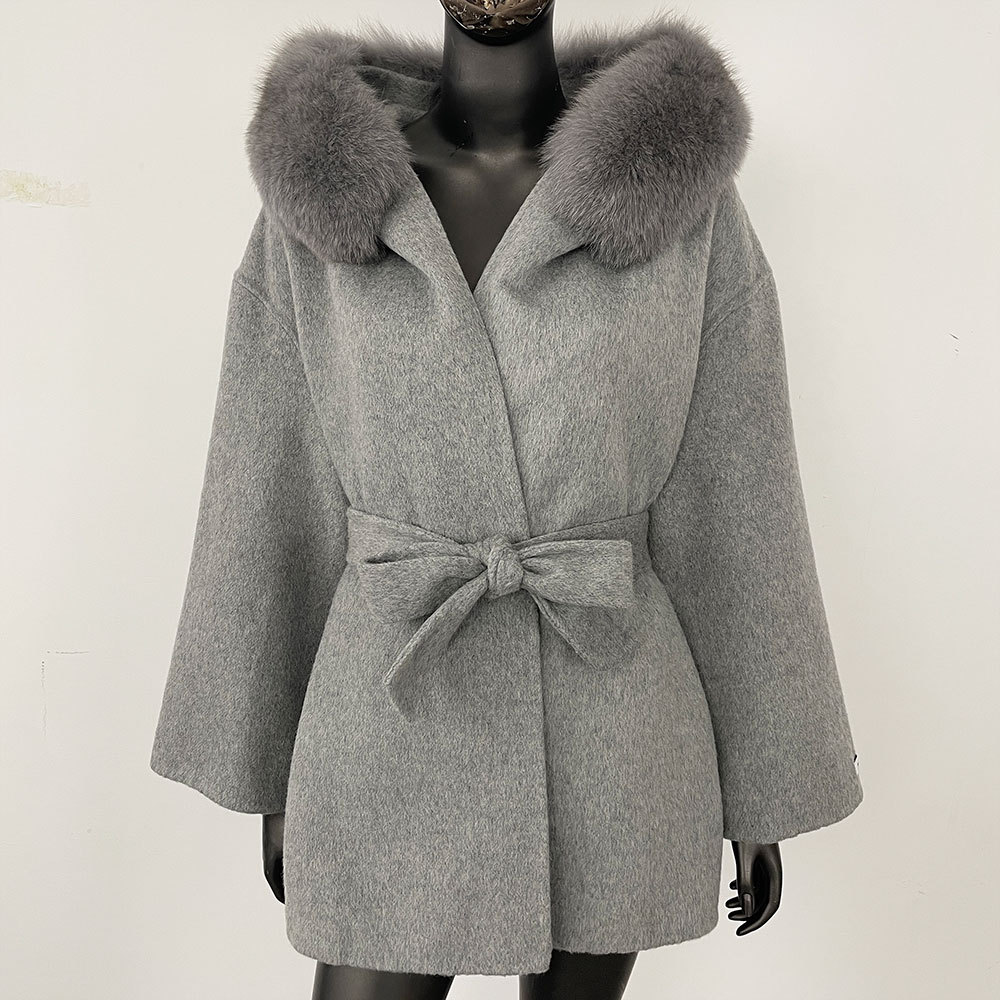 2025春の新型キツネ毛襟両面カシミヤコート女性の中で若いタイプの帽子付きジャケット