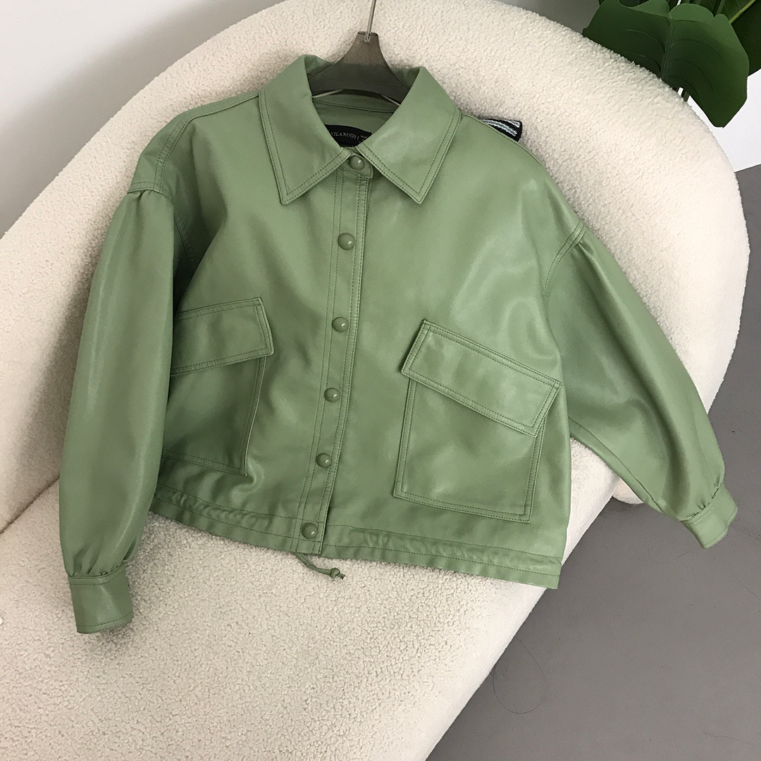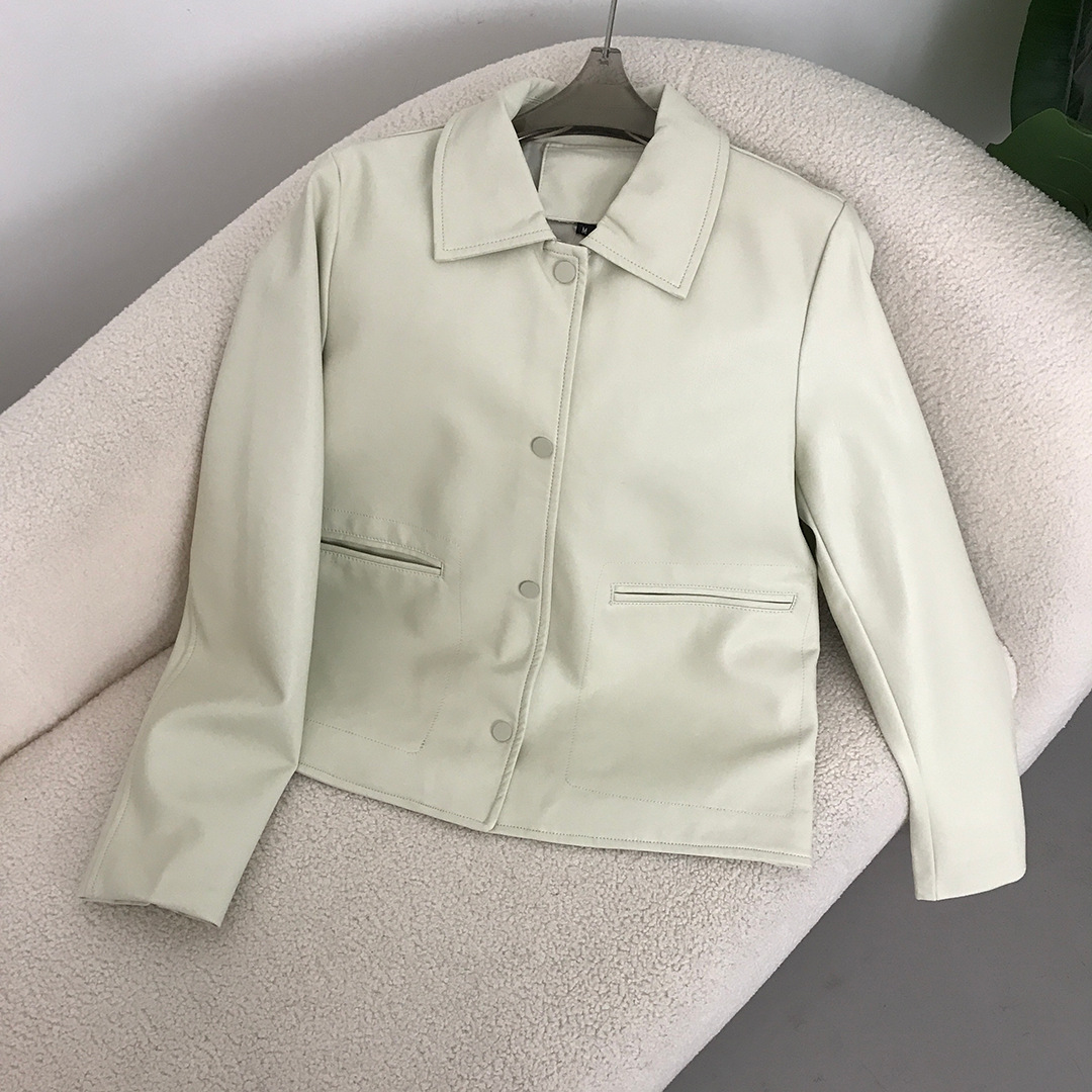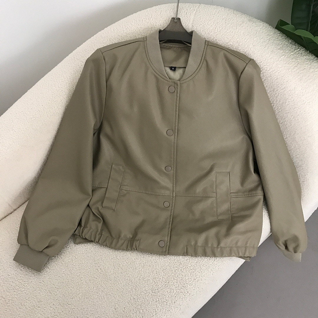 2024春と秋の新型単列ボタン野球服の短い革のコートの女性はやせているファッションのpu革のジャケットの女性を見せます。