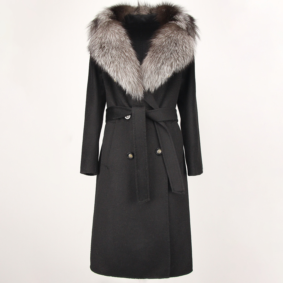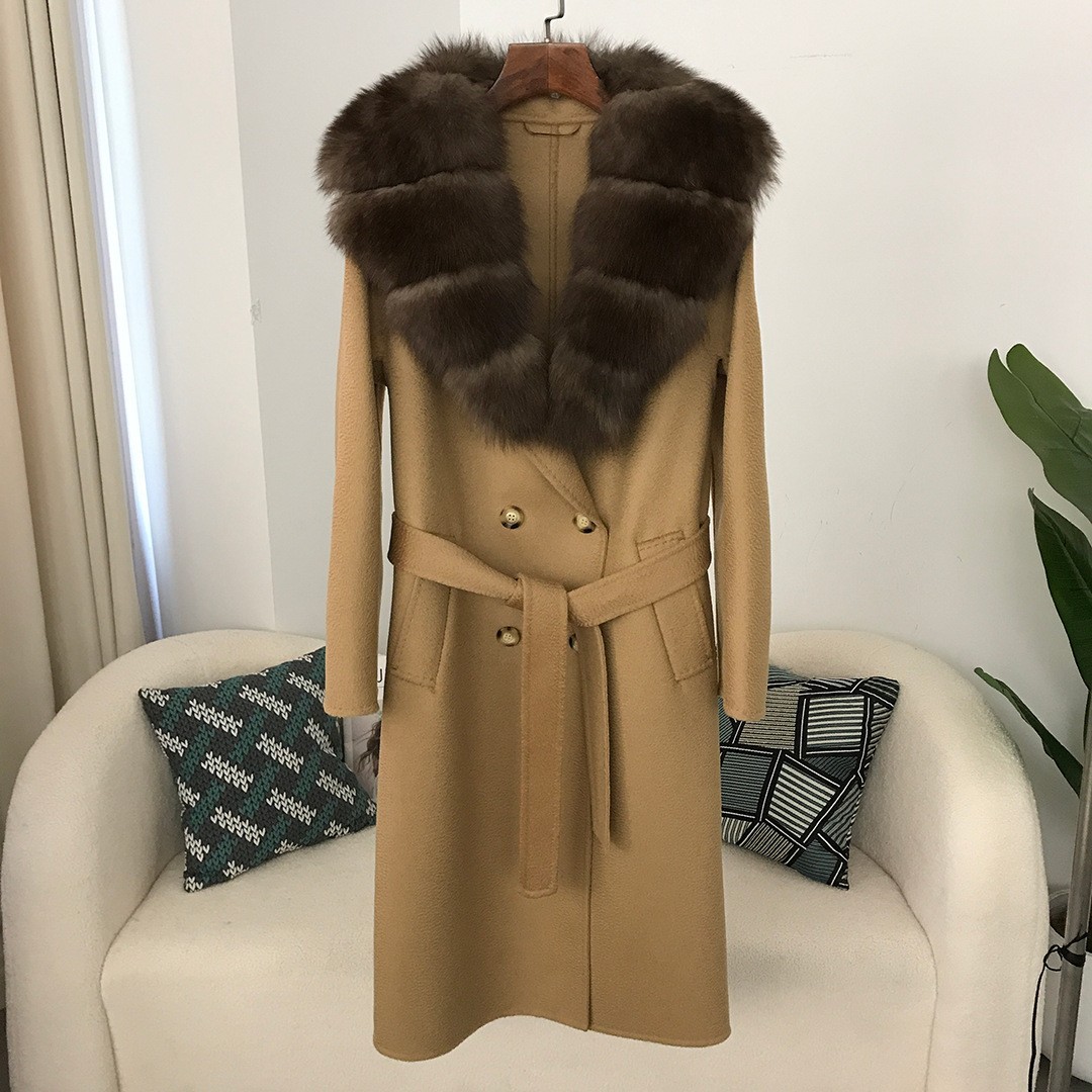 2023秋冬の新型両面カシミヤコート女性のロングタイプの高級水波紋キツネ毛襟両面ウールコート