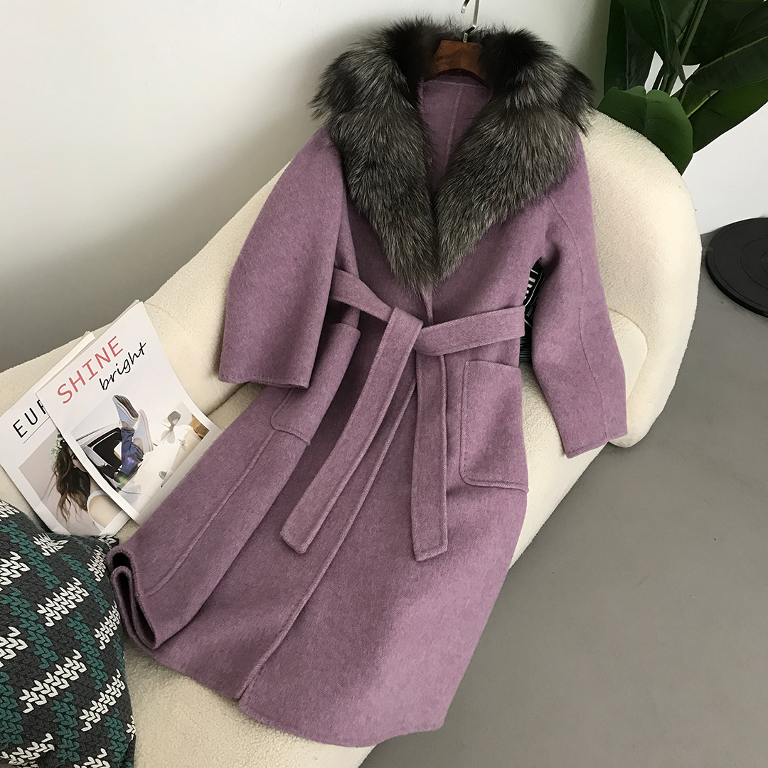 秋冬の新型の両面のカシミヤのコートの女性の長いタイプのハイエンドの水の波紋の狐の毛の襟の両面のウールのコートのコート