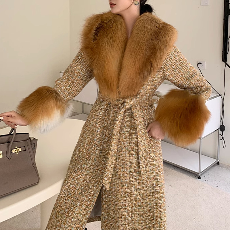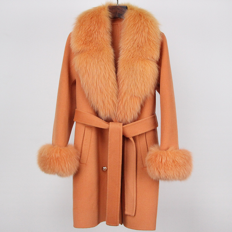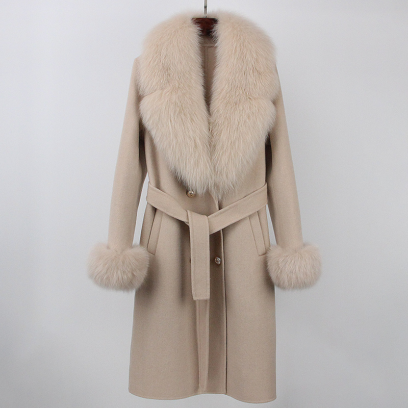 現物の女性のキツネの毛のカシミヤの毛はコートの女性の秋冬のコートの女性の高級感の両面のウールのコートです。
