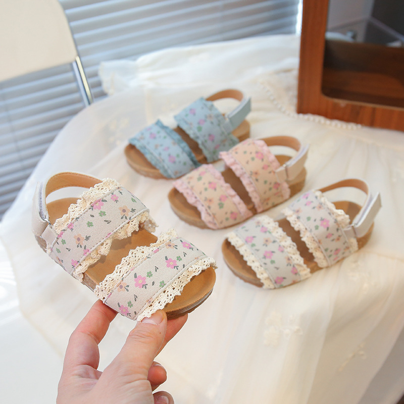 女の子のファッションの花の田園風の露指のサンダル2025夏の新型の柔らかい底の甘い蝶結びの王女の靴の潮