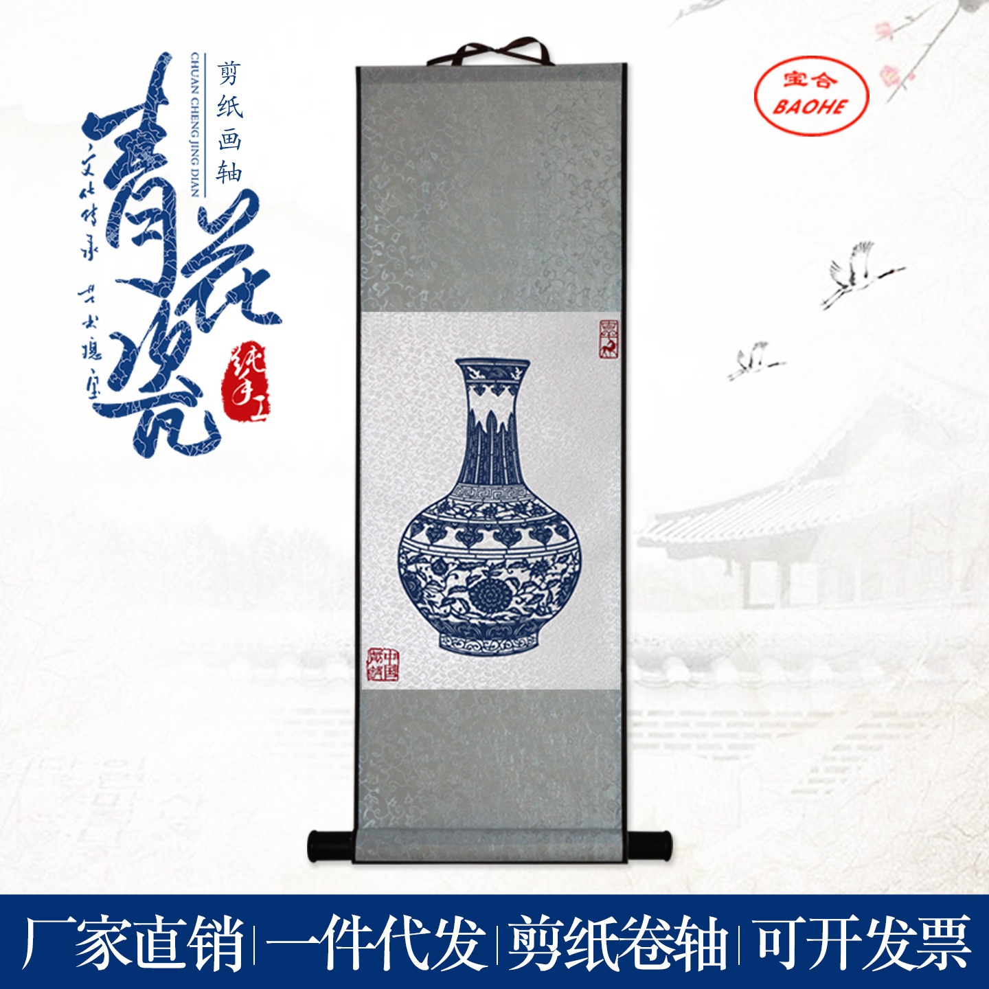 中国の特色のある手作りの切り紙青花磁器の窓の花は80センチの画軸を飾ります。