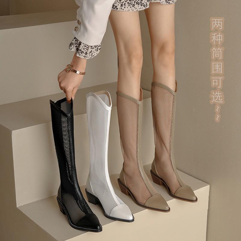 夏の白いブーツの女性の騎士のブーツの透かし彫りのネットの薄いタイプのマーティンの靴の高い筒のネットの靴のサンダルの長い筒の大きい筒の周囲