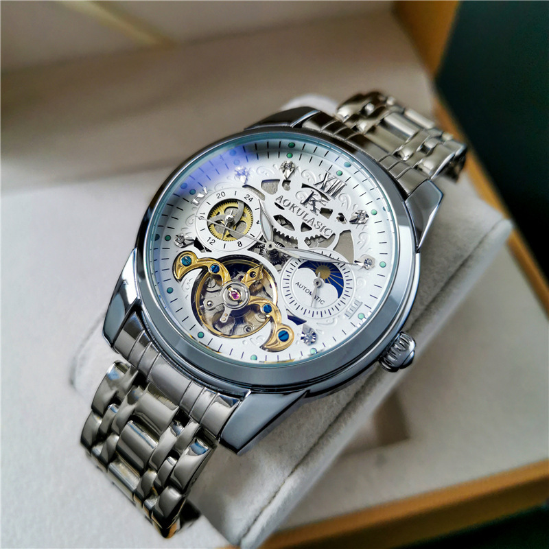 透かし彫りの大きい飛輪の全自動機械の時計の男性の時計の防水の夜光の月相の多機能の腕時計の男性は代行します。