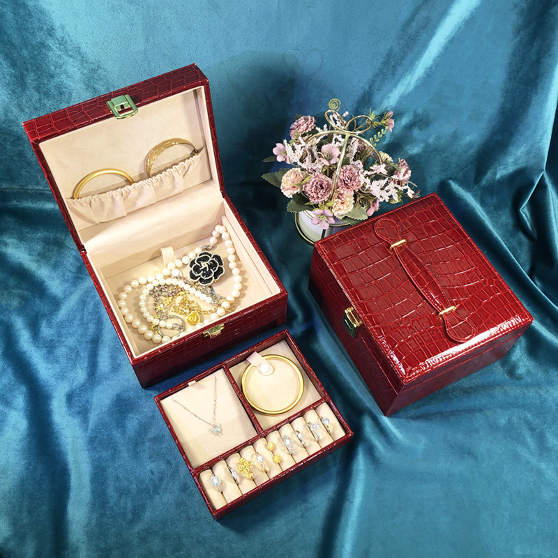 メーカー卸売り大ワニ紋皮革便利アクセサリー箱ファッション二重収納三金五金箱