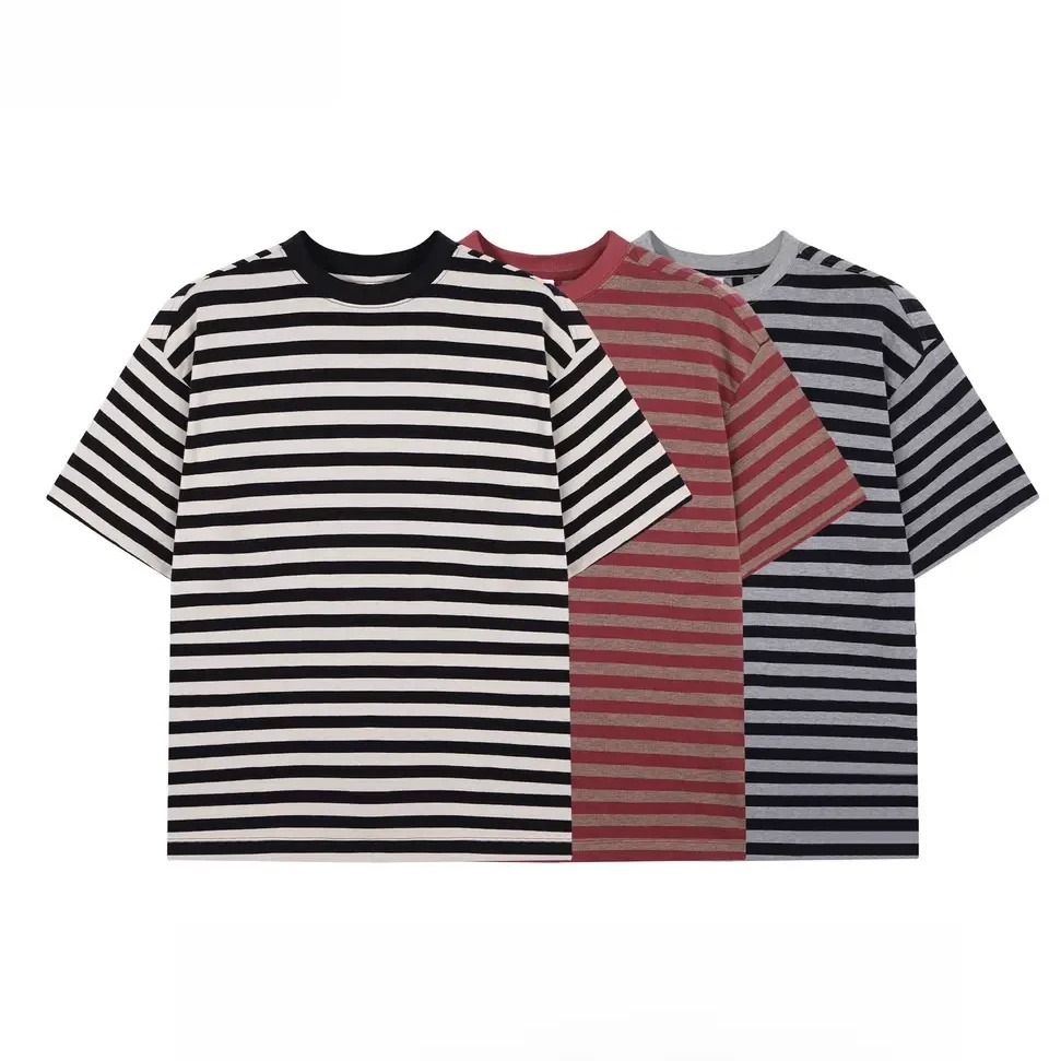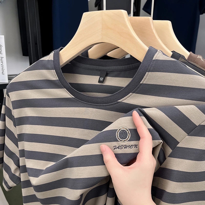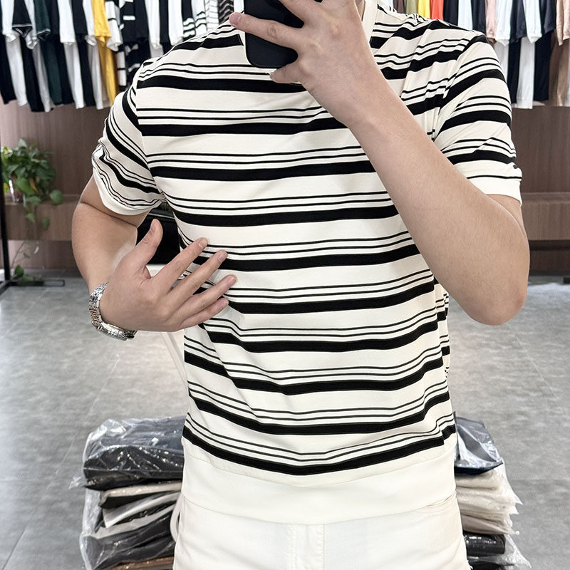 夏の新型半袖tシャツ男性ファッションヨーロッパ版通気性丸首tシャツストライプ夏青年上着カジュアルtシャツ