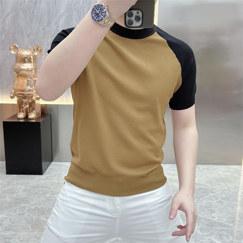高級ニット氷麻半袖tシャツ丸首男性氷糸ファッション格好いい半袖tシャツ軽贅沢品質メンズ