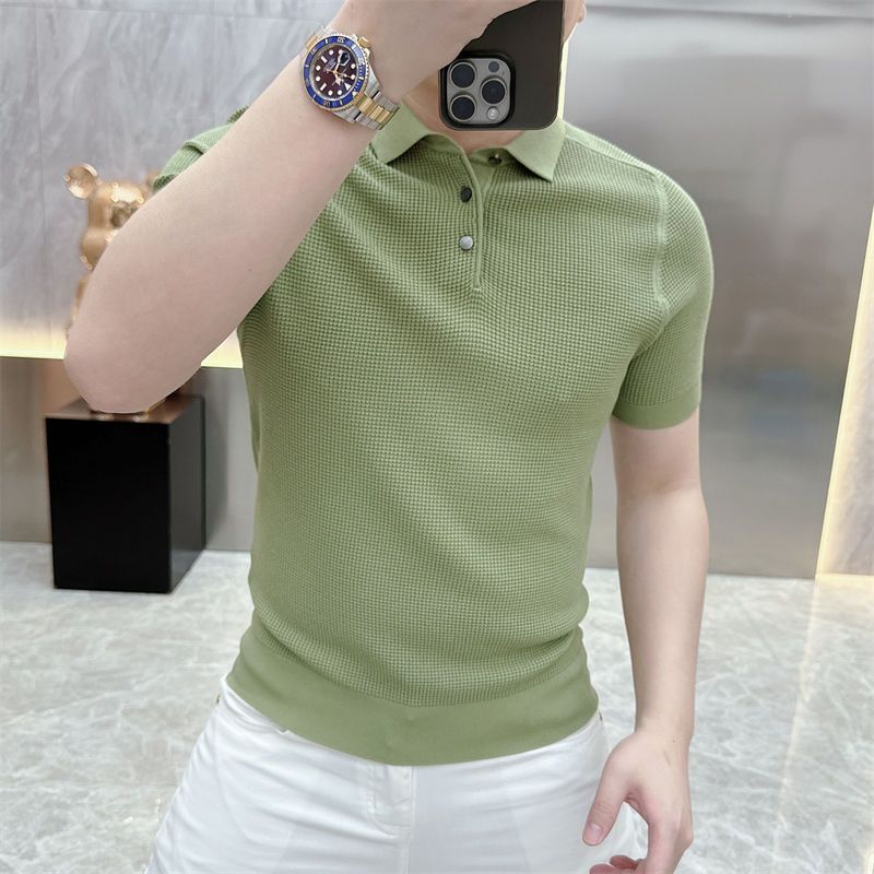 高級軽豪華シンプルカジュアルニットpoloシャツ男夏ファッション韓国風氷糸折り襟半袖tシャツ