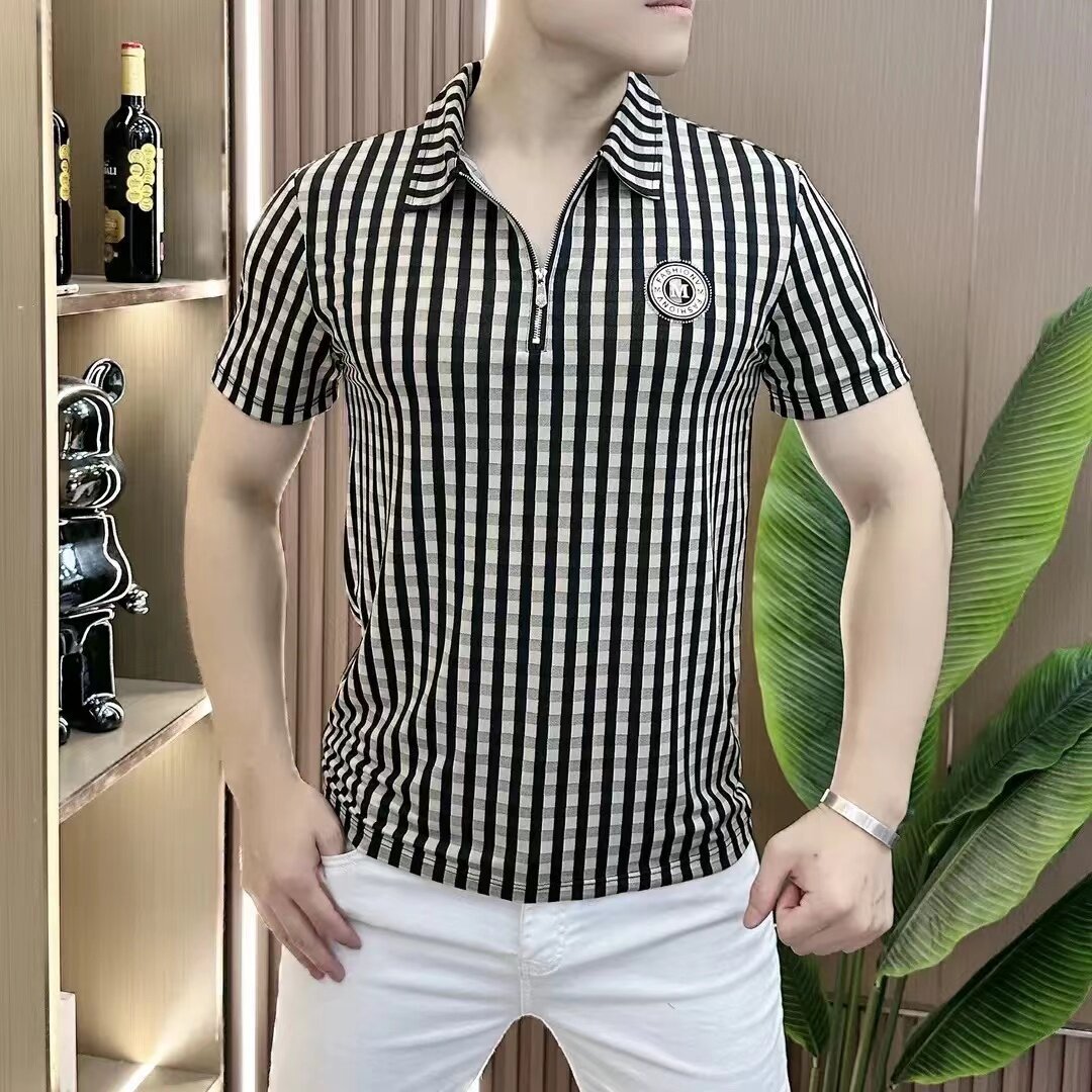 メンズ夏カジュアル多用途半袖クラシックストライプファッショナブルでハンサムなTシャツアイスシルクハーフジップシャツTシャツ