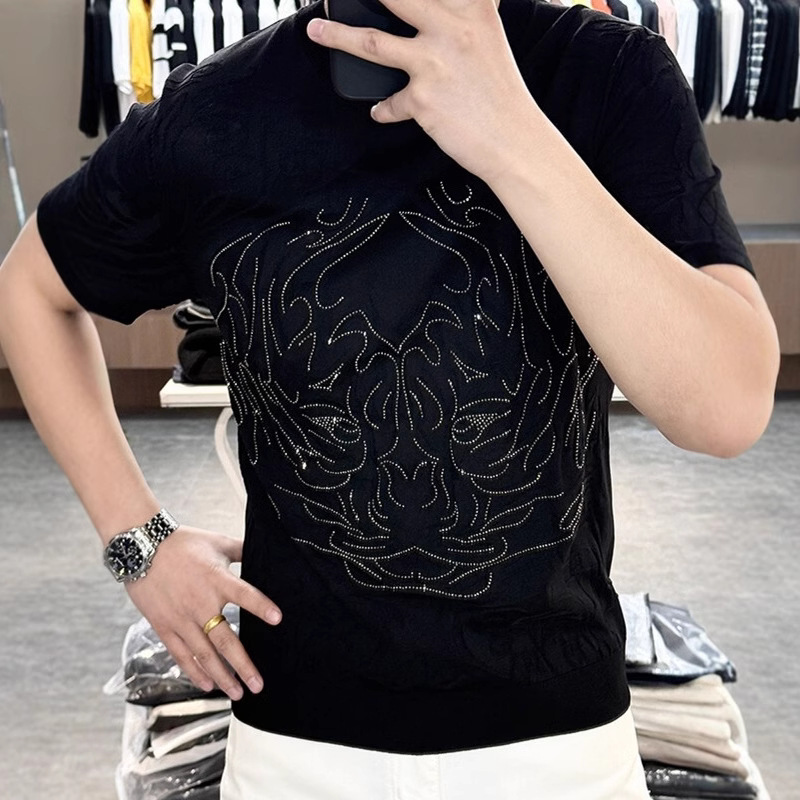 2025氷糸ニットtシャツ夏の新型ホットドリルプリント虎頭ファッションカジュアル男性半袖tシャツ男性服