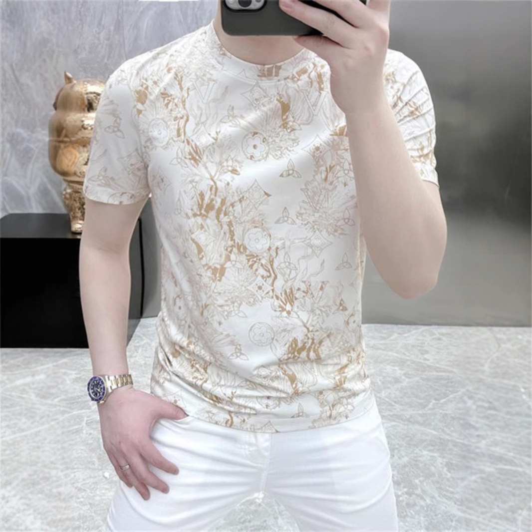 【格好いい贅沢】2025夏の新型シルクアルファベット修身丸襟半袖tシャツ男性青年半袖