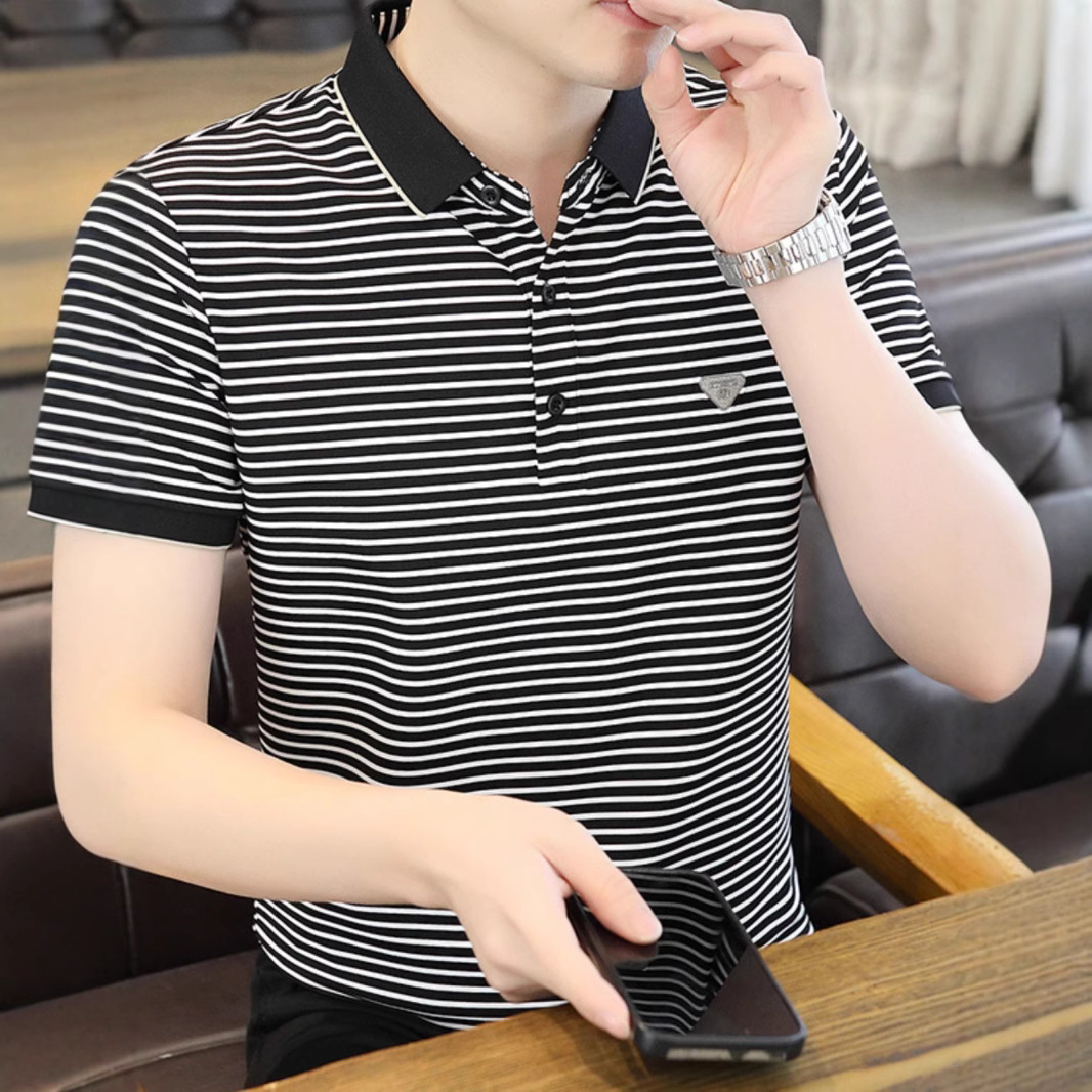 ハイエンドカジュアルビジネスストライプpoloシャツ男性夏の成熟した落ち着いた襟付き半袖tシャツ青年半袖上着