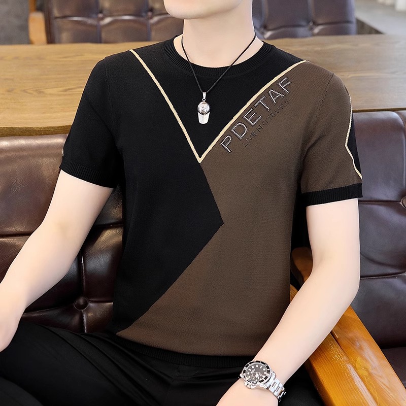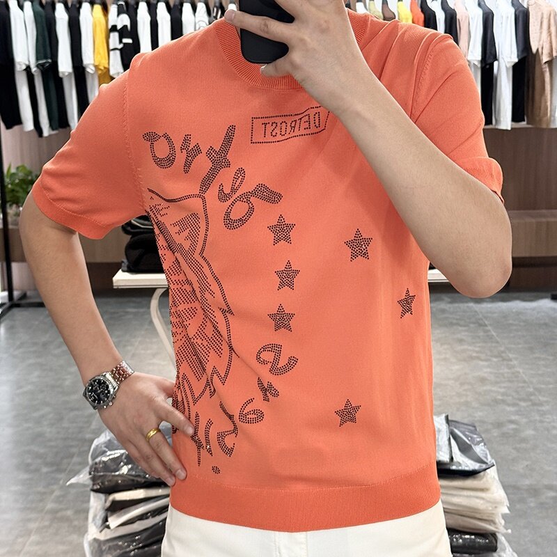 男性潮牌氷糸ニットtシャツ新型2025かっこいい高級夏ファッション修身半袖夏上着