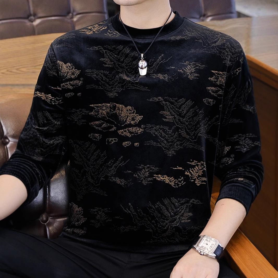 秋冬の金のベルベットの丸首の底のシャツの男性の新型の潮のブランドの国風のtシャツのごろつきのかっこいい山水画の上着の大きいサイズ