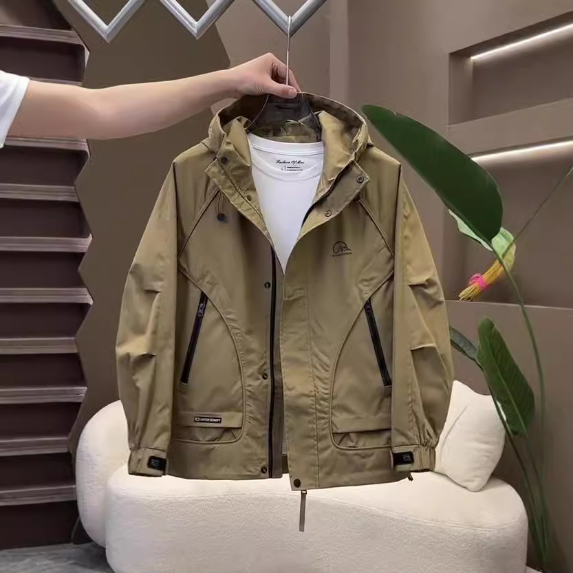 ジャケット男2024春秋工装フード付きショートコートのファッションブランドのゆるいカジュアル男の新しい長袖上着